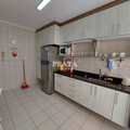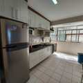 A cozinha conta com móveis planejados, prática e funcional, com acesso à área de serviço e à dependência de empregada.
